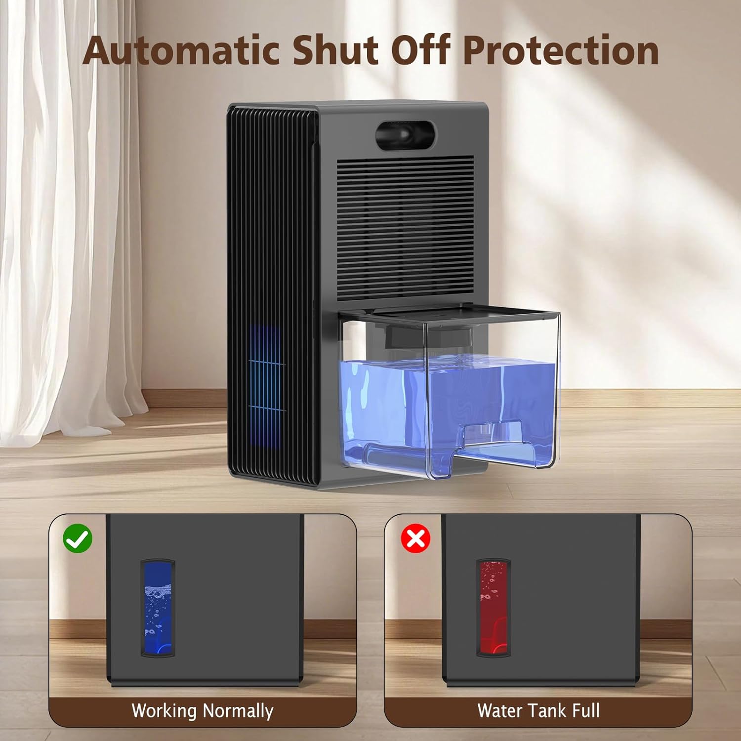 - Apagado automático: ¡Funcionamiento sin preocupaciones! Nuestro deshumidificador se apaga automáticamente cuando el tanque de agua está lleno o colocado incorrectamente. Esto evita derrames y ofrece mayor seguridad y comodidad, especialmente cuando no estás en casa.