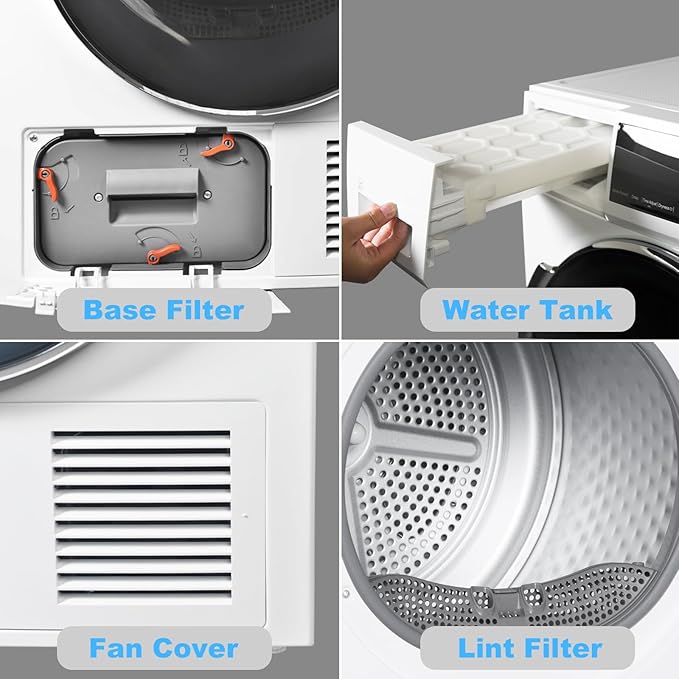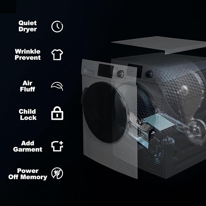 - Secador de bomba de calor sin ventilación: ideal para espacios compactos como un apartamento, casa pequeña, esta secadora sin ventilación ofrece un funcionamiento aerodinámico para que puedas secar de forma segura lana, algodón, prendas delicadas, toallas, ropa de bebé y más en áreas más pequeñas y confinadas