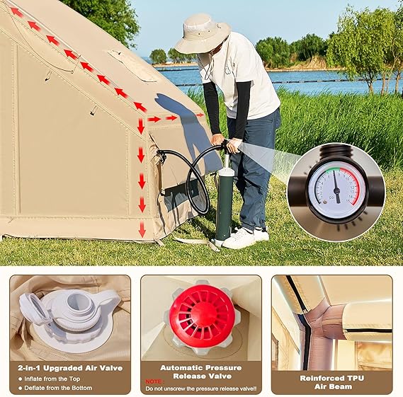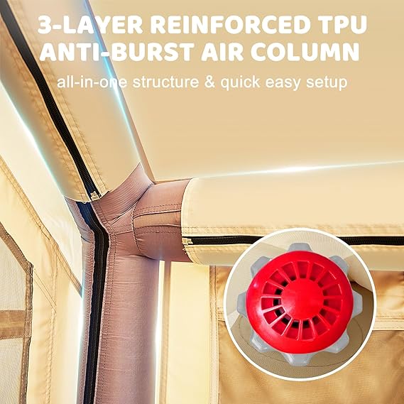 - Tienda inflable de fácil instalación en 5 minutos: la tienda de campaña inflable cuenta con un innovador marco de haz inflable, sin necesidad de varillas complejas; la configuración y el almacenamiento son muy fáciles. Viene con una bomba de aire de inflado rápido de alta presión, y puedes tener la tienda lista en solo 5 minutos. En comparación con las tiendas de campaña tradicionales, es mucho más simple de instalar y más rápido de empacar.