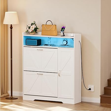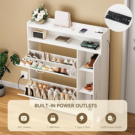 Artswish Zapatero grande con tomas de corriente y luz, armarios delgados para zapatos con 2 cajones abatibles y armario lateral y almacenamiento abierto, zapatero de almacenamiento para entrada