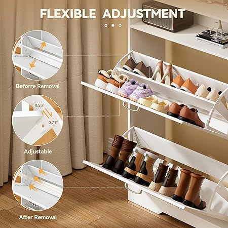 • Se adapta a todos tus zapatos, incluso botas. — Almacena todo, desde zapatos planos hasta botas hasta la rodilla. Dos cajones abatibles tienen estantes ajustables para tenis, tacones o chanclas. El armario lateral también tiene estantes ajustables, perfectos para botas más altas (media pantorrilla o superior). Zapatero con 2 cajones abatibles puede contener 20-30 pares de zapatos (dependiendo del tamaño del zapato).