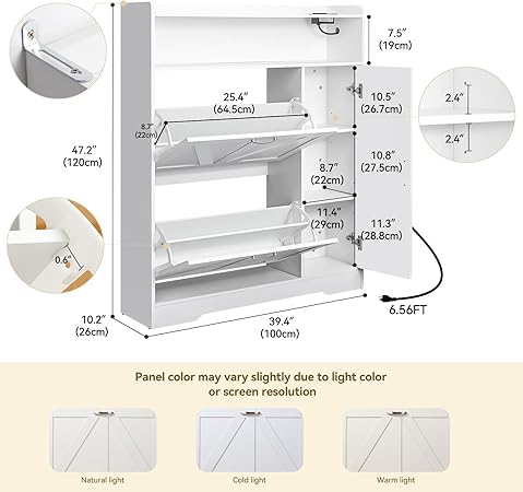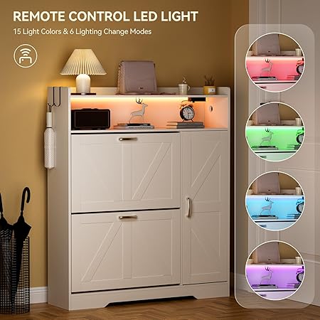 • ✨ Ilumina tu entrada y carga tu equipo: este gran zapatero ilumina tu espacio. La tira de luz integrada tiene colores ajustables y un control remoto, perfecto para encontrar zapatos en la oscuridad o establecer el estado de ánimo. Además, cuenta con una toma de corriente con un cable de 6.5 pies, que incluye 2 salidas de CA, 1 puerto USB y 1 puerto tipo C. No más buscar tomas de corriente o tropezar con cables de extensión: conecta lámparas, cargadores o tu aspiradora justo donde los necesites
