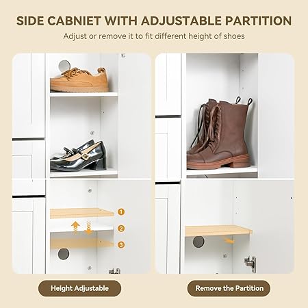 • ✨ Se mantiene fresco y proporciona seguridad: diseñado para respirar. La parte trasera abierta y los orificios laterales permiten que el aire circule y disipe los olores, ideal para entradas, pasillos, vestíbulos o porches. El gabinete de almacenamiento de zapatos cuenta con hardware de metal anti-punta para seguridad y estabilidad.