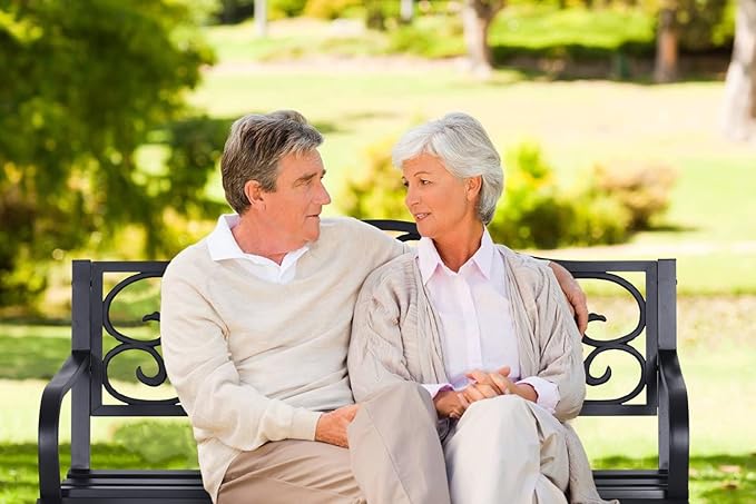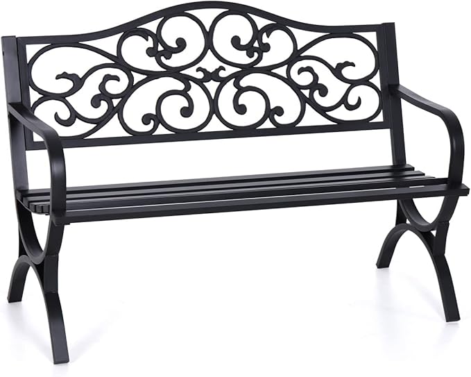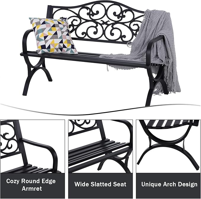 - Resistente y seguro: este banco de jardín está hecho de respaldo de hierro fundido y marco de metal, que es estable y resistente para un uso a largo plazo. La silla está acabada con bordes redondos y superficie lisa, lo que te proporciona una relajación segura