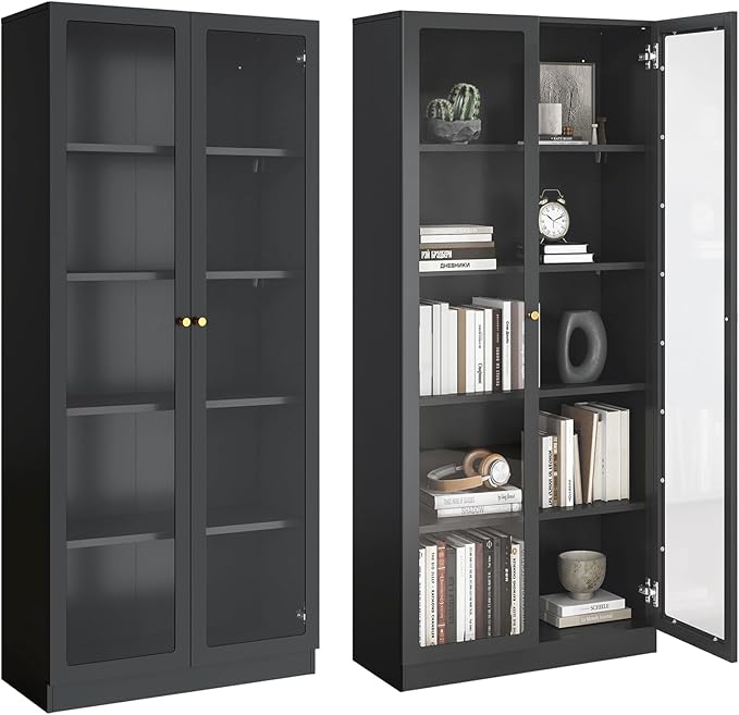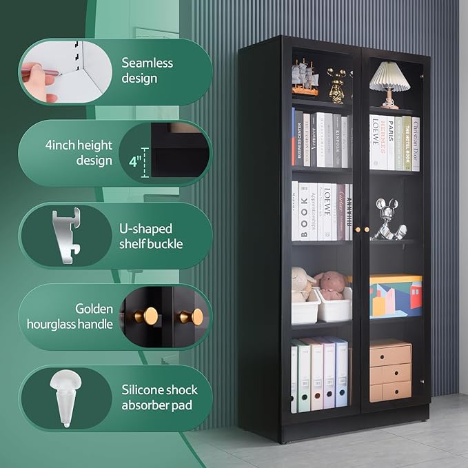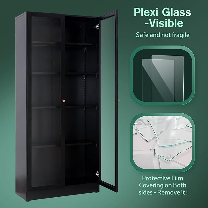 - Librería con puertas: La vitrina de vidrio utiliza puertas de vidrio acrílico, que son transparentes y visibles, y su peso ligero puede reducir el riesgo de que el gabinete se incline hacia adelante cuando se abre la puerta. Para proteger la puerta, se ha aplicado una película protectora a cada lado de la puerta. Puedes quitar la película protectora de acuerdo con las instrucciones (idioma español no garantizado)