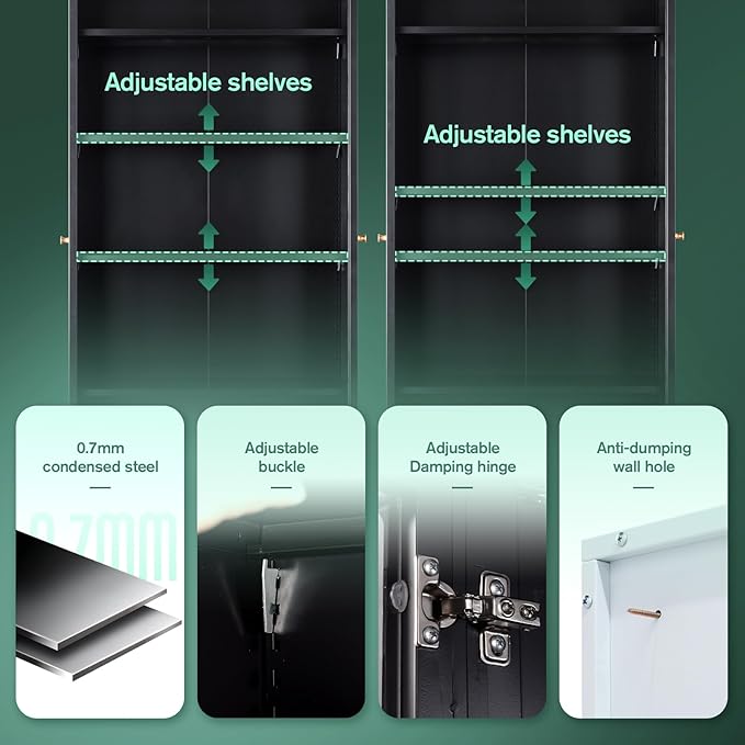 - Estantería de 5 niveles en construcción resistente: la estantería de metal multifuncional IRONMIX con puertas y estantes está hecha de acero laminado en frío de alta calidad de 0.028 in, que es resistente y no se deforma fácilmente. Hay costillas de refuerzo en la cintura y la parte inferior del panel posterior, lo que aumenta aún más la resistencia de la estantería