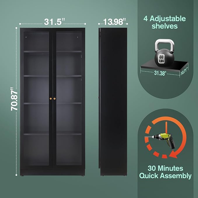 - Estantería alta con estantes ajustables: el estante para libros de 5 niveles está diseñado con 4 estantes ajustables que se pueden ajustar o quitar para satisfacer tus diferentes demandas de exhibición o almacenamiento. Medición de 13.98 pulgadas de profundidad x 31.5 pulgadas de ancho x 70.87 pulgadas de alto. Cada estante de la estantería con armario de almacenamiento puede soportar un peso de 88 libras, por lo que es perfecto para almacenar libros, documentos, decoraciones de muñecas, exhibiciones de curiosidades, platos de comedor, utensilios de cocina, artículos para el hogar y herramientas de garaje
