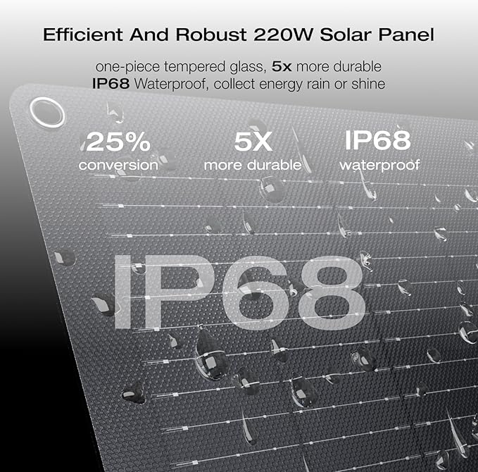 - Ligero y resistente al agua: el panel solar de doble cara de 220 W es plegable y compacto, pesa solo 15.4 libras, por lo que es fácil de transportar o almacenar. Con un diseño delgado de vidrio templado, es 5 veces más duradero que los paneles solares similares. Su clasificación IP68 lo hace resistente al agua y al polvo.