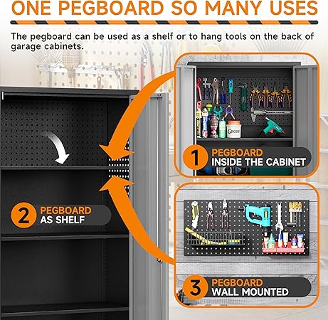• 🎄【Tableros de clavijas versátiles】Hay un tablero de clavijas dentro del armario alto de almacenamiento de garaje, que se puede utilizar como un estante para colocar herramientas de tamaño mediano o colgar en la parte posterior del armario de almacenamiento según sea necesario, organizando eficazmente tus objetos pequeños. Además, el tablero de clavijas también se puede quitar y colgar en la pared para su uso