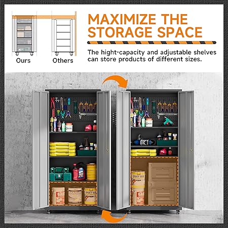 • 🎄【Fácil de montar】 El armario de almacenamiento con cerradura viene con instrucciones de montaje y videos de instalación, lo que facilita el montaje. Hay dos formas de utilizar el gabinete de almacenamiento de herramientas de garaje. Puedes elegir instalar ruedas en los armarios de garaje para una fácil movilidad, o puedes fijarlo a la pared con un diseño anti-vuelco