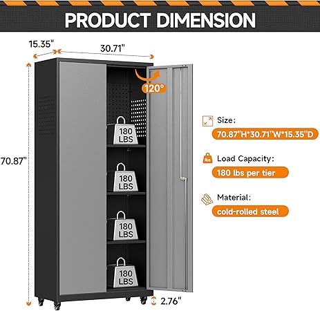 • 🎄【Espacio de almacenamiento adecuado】Nuestro armario de almacenamiento de metal para garaje: 70.87 pulgadas de alto x 30.71 pulgadas de ancho x 15.35 pulgadas de profundidad, equipado con 3 estantes ajustables. Puedes ajustar la altura de los estantes de acuerdo a tus necesidades de almacenamiento para satisfacer el almacenamiento de varios tamaños de artículos, proporcionando una solución perfecta para tu almacenamiento de garaje