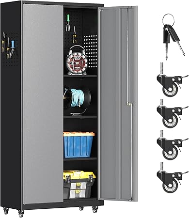 Armarios de almacenamiento de metal de 71 pulgadas de alto con ruedas y tableros de clavijas, gabinete de herramientas rodante gris con estantes ajustables y puertas con cerradura para garaje, almacén